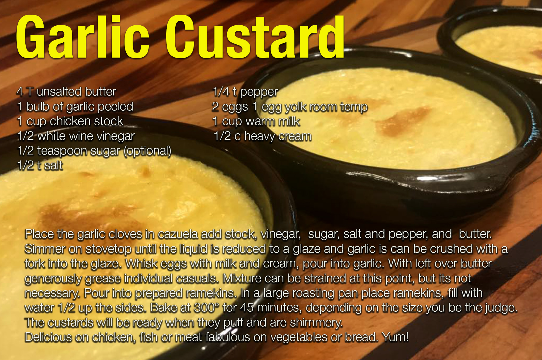 water 1/2 up the sides. Bake at 300° for 45 minutes, depending on the size you be the judge. The custards will be ready when they puff and are shimmery. Delicious on chicken, fish or meat fabulous on vegetables or bread. Yum!